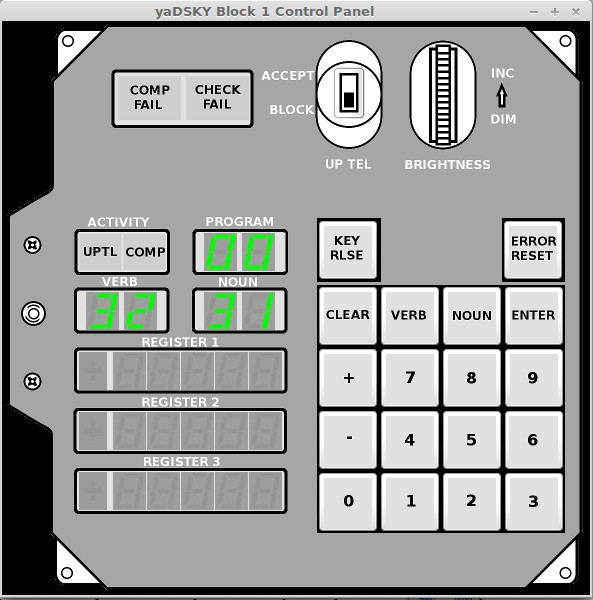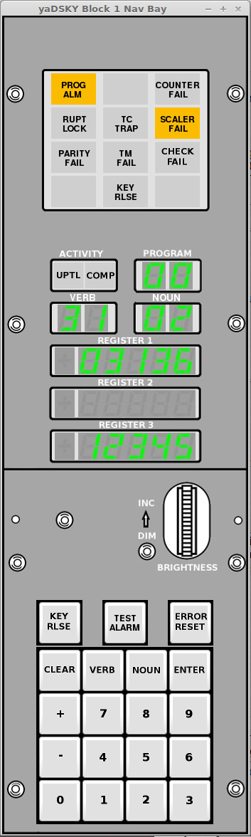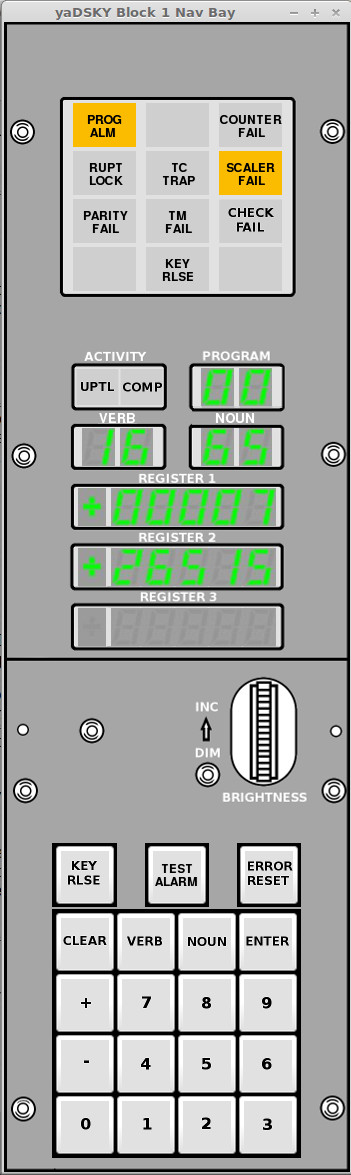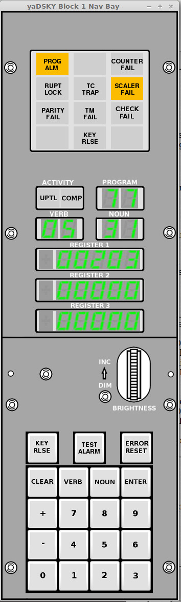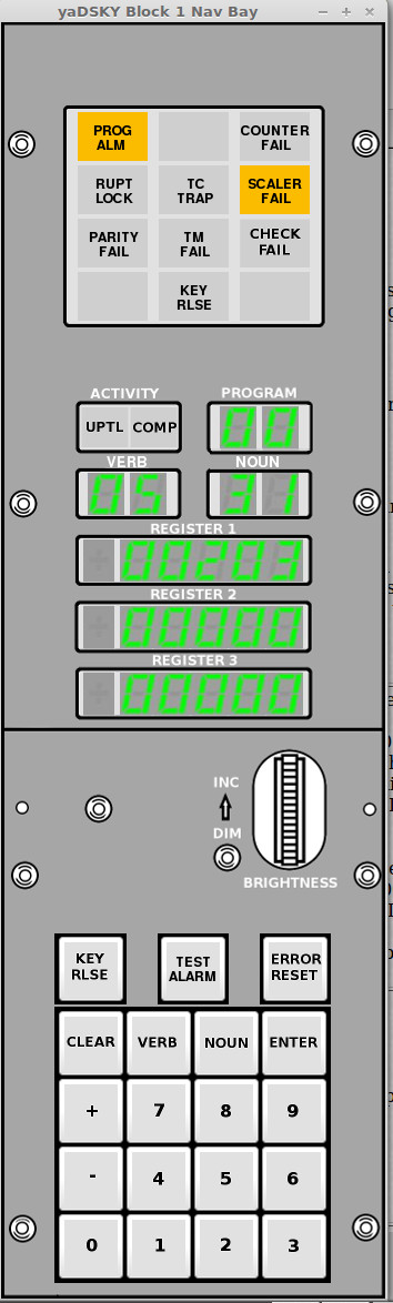 enough to take a screenshot of it. At first, it will really show "PROGRAM 00" rather than "PROGRAM 77", because the AGC is in "major mode" 00. What has happened, however, is that on power-up the AGC hasn't been able to detect any Inertial Measurement Unit (IMU), because we don't have a simulation for one hooked up to it! Detecting this condition, a specific AGC program called the "Night Watchman" has detected this condition and decided to flip over to major mode 77 ... which isn't documented, as far as I can tell, and none of the original AGC developers I've contacted remember it, including Jim Kernan, who was Solarium's "rope mother". Of the other items displayed, "VERB 05" is an "octal display of data" while "NOUN 31" indicates that the data being displayed is "Failreg", the failure register. The 5-digit displays, I believe, are the last three error conditions reported, of which only one, 00203 actually has an error code in it. Thus, you are seeing "Alarm 00203". According to the source code, alarm 00203 is "NO IMU MODE INDICATED TO COMPUTER". The IMU mode is communicated to the AGC through its input register IN2, I believe, which is all zeroes at this point, given that there is no IMU, and all zeroes is not recognized as a legitimate IMU mode. |