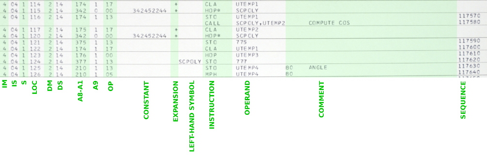 LABEL CDS CONSTANTFormat of the source-code portion of the assembly listing: Consider a "normal" section of the listing, containing code, comments, etc., as opposed to report tables generated by the assembler, to which I've added some markup (in green) for explanatory purposes: